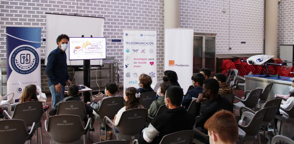 El pasado viernes 11 de febrero (coincidiendo con el Día Internacional de la Mujer y la Niña en la Ciencia) se celebró en la Cafetería de la ETS de Ingeniería de Telecomunicación, el evento “ChocoTech”, unas mini-charlas sobre tecnología (satélites, drones, coche conectado, …). Concluyeron con una merienda (chocolate con churros, bocadillos, fruta, …) en la que se fueron resolviendo las dudas que surgieron entre los asistentes (niños, jóvenes y adultos).